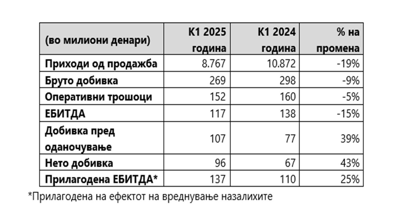 Бруто-добивката достигна 269 милиони денари, што претставува намалување од 9% споредено со истиот период минатата година. Добивката пред оданочување изнесува 107 милиони денари.