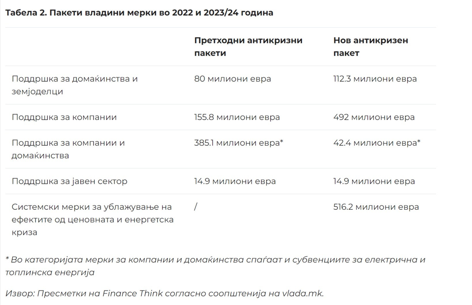 По обем, најновиот антикризен пакет е сличен со претходниот (за 2022 година) кој изнесуваше 760 милиони евра. Сепак, јачината на кризата и фазата во која беше економијата во 2022 споредено со денес се драстично различни. Во текот на 2022 година, енергетската криза го имаше својот врв, како резултат на рекордните цени на примарните производи од храна и енергија. Додека, денес, цената на енергентите и производите од храна на глобалните пазари е стабилизирана или намалена, а домашната понуда на електрична енергија се зголеми. Оттука, ако минатата година имавме акутна состојба и постоеше реално оправдување за обемен пакет антикризни мерки, оваа година се наоѓаме во излезна фаза од кризата. Оттука, вкупниот планиран буџет е несоодветен на моменталната потреба. Истовремено, иако пакетот е наречен антикризен, мерките опфаќаат и цели кои не се директно поврзани со кризата, што може да предизвика погрешна перцепција, особено имајќи предвид дека државата влегува во предизборен период. Во тој поглед, клучната препорака е наместо постојан кризен фокус, во оваа фаза тој да се префрли на градење отпорност и одржливост на економијата.