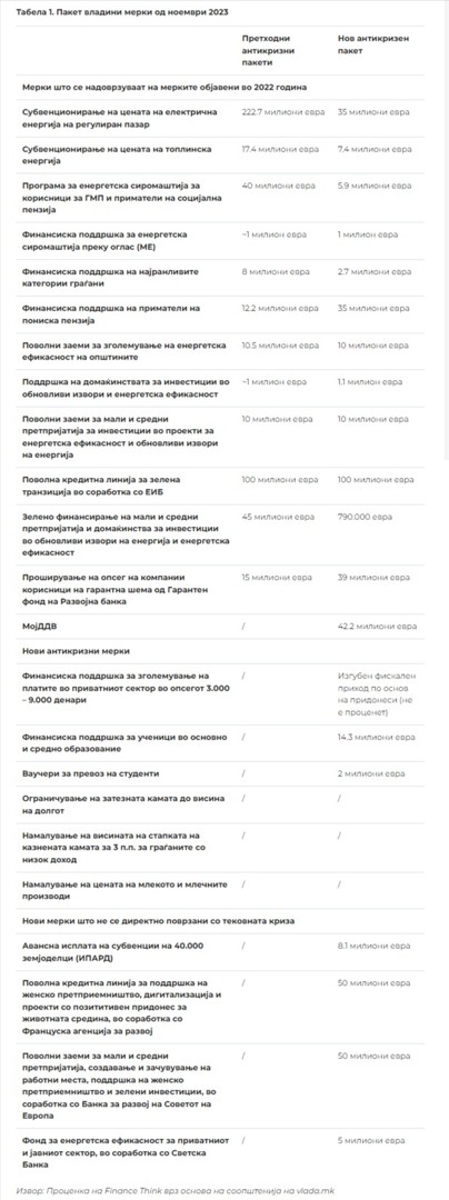 Од вкупно 26 мерки, 13 се надоврзуваат на мерките објавени во 2022 година, од кои шест се картактеризираат како антикризни мерки, а останатите седум како мерки кои придонесуваат за ублажување на ефектите од кризата, но постоеја или веројатно би постоеле и доколку криза немаше. Потоа, шест се нови мерки кои пружаат времена поддршка на доходот на ранливи категории граѓани и, оттука имаат карактер на нови антикризни мерки; додека, преостанатите четири се нови мерки кои не се директно поврзани со кризата. Забележливо е дека, барем кај мерките кои се директно сврзани со кризата, поединечните буџети се намалени во однос на претходниот пакет, што во голема мера се должи и на постепеното напуштање на линеарните мерки за сметка на таргетираните мерки, што беше поранешна препорака од, но и услов кој земјата го презеде за стекнување на Аранжманот за претпазливост и ликвидност од Меѓународниот монетарен фонд, порано годинава.