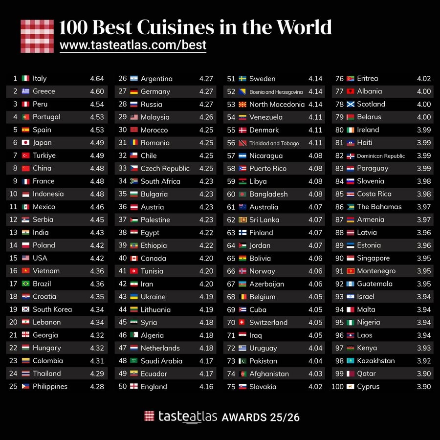 Ова рангирање е направено врз основа на 590.228 валидни оценки за 16.357 јадења во базата на податоци на добро познатата кулинарна страница „Taste Atlas“, па затоа овие кујни освоија највисоки просечни оценки. Овие кујни не се само вкусни: тие раскажуваат приказни за традициите, културата, географијата и историјата на народот.